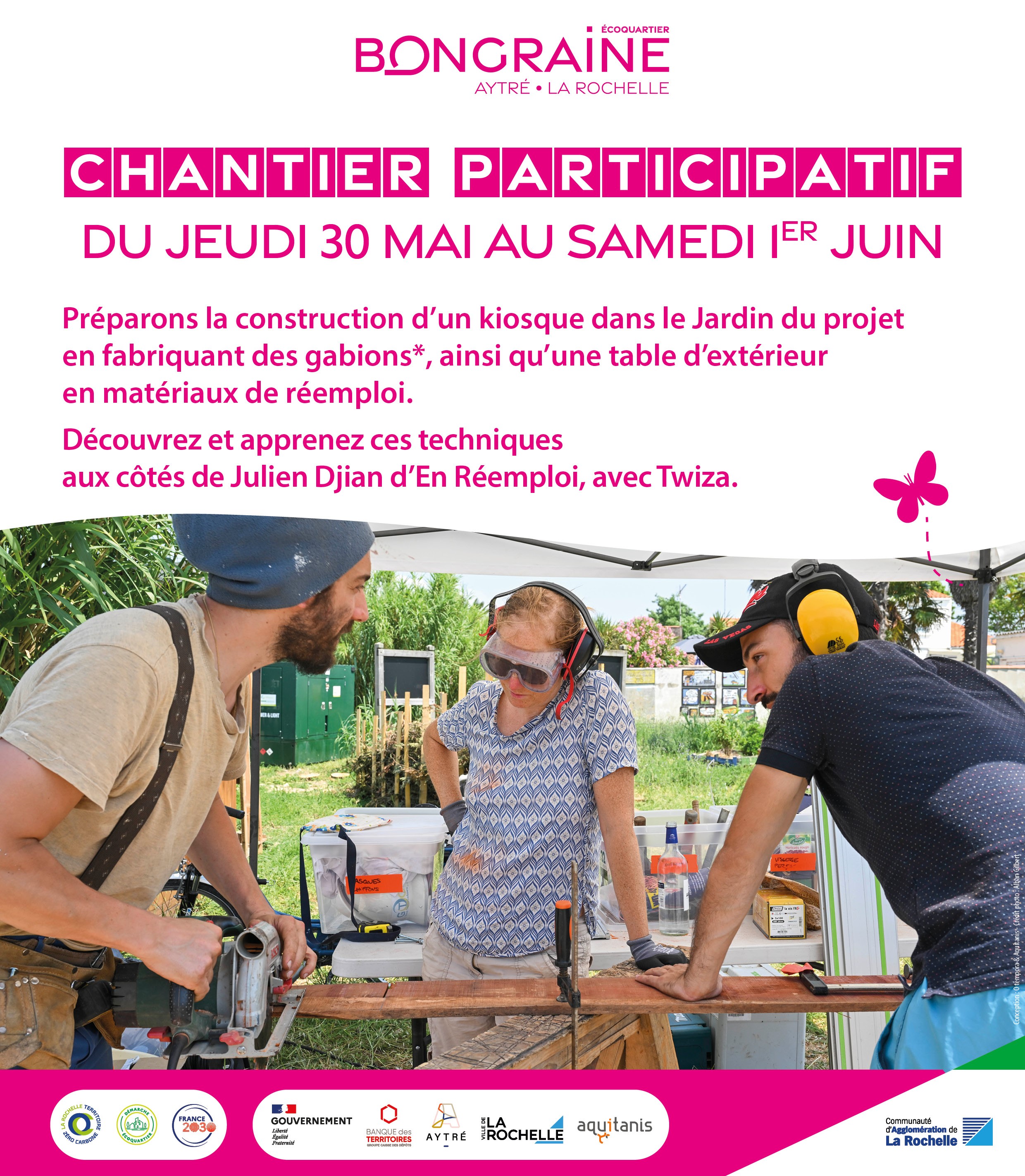 L'accueil se fera tous les matins à la permanence du projet (au 2 rue de Bongraine à La Rochelle) autour d'un café. Le site de l'atelier est situé tout près sur un jardin qui est aujourd'hui par les futurs habitants et les riverains du projet.